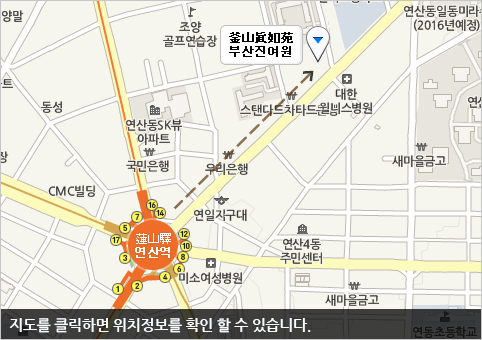 • - 연산역 12번 출구로 나와서 도보로 6분. 농협 중앙회 옆 대한 웰니스 병원 맞은편에 위치